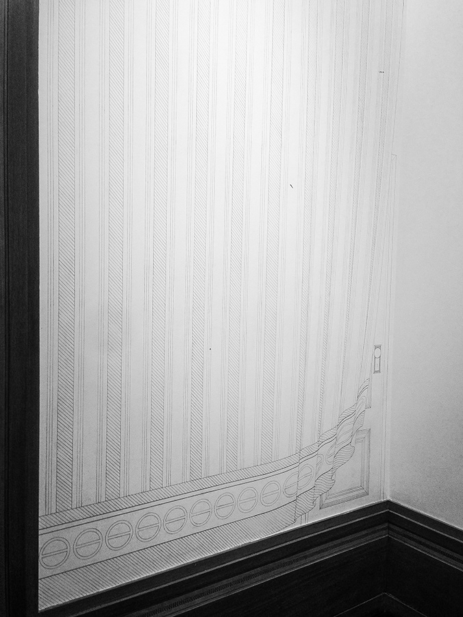 The Madlener house was designed by Robert E. Schmidt in 1902. From a distance it is severely proportioned, yet intricately ornamented up close. It was once a home to a family and now its 9,000 square feet are devoted to office and exhibition space. Some look at the house and see cues from Louis Sullivan, maybe Frank Lloyd Wright. When we look at the Madlener house two periods come to mind: Italian Renaissance and German Neoclassicism. Borrowing from Karl Friedrich Schinkel’s vertically striped wallpaper in the Tent Room of the Charlottenhof Palace and Andrea Mantegna’s painted curtains from the Ducal Palace’s Bridal Chamber, we draw a two-dimensional illusion that is at once surface and not. Looking from left to right across the wall’s two halves, a repetitive wallpaper made up of vertical and 45-degree lines is freed from its static picture plane to reveal a small door. The wallpaper, now a curtain, is drawn back and upon this discovery, the drawing’s limits are exposed. At first glance, part of the drawing remains foregrounded; it could still be mistaken for wallpaper. These assumptions remind us that, as grown-ups, not only is our sight diminishing, but our height might not take in the full picture—like film before Yasujirō Ozu. Now, the observer is invited to kneel to the height of a child, and look again where one might see more than just gum stuck to the bottom of tables.
