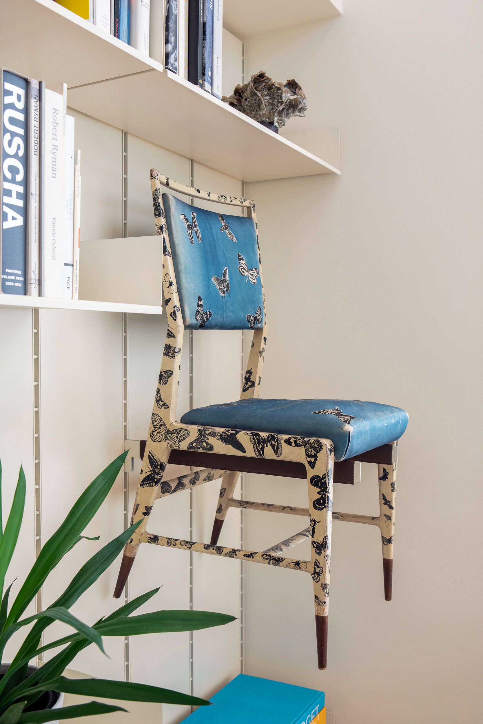 The owner's extensive collection of midcentury and contemporary art and furniture is incorporated into a complete renovation of existing finishes, fixtures, and equipment that includes a new library, kitchen, two bathrooms, and three bedrooms. The renovation includes bespoke furniture designed by the architects, including a set of uniquely shaped barstools, a white oak platform bed, a George Nelson inspired shower bench made entirely from ipe, as well as a custom display wall to suspend multiple chairs above a bookshelf.