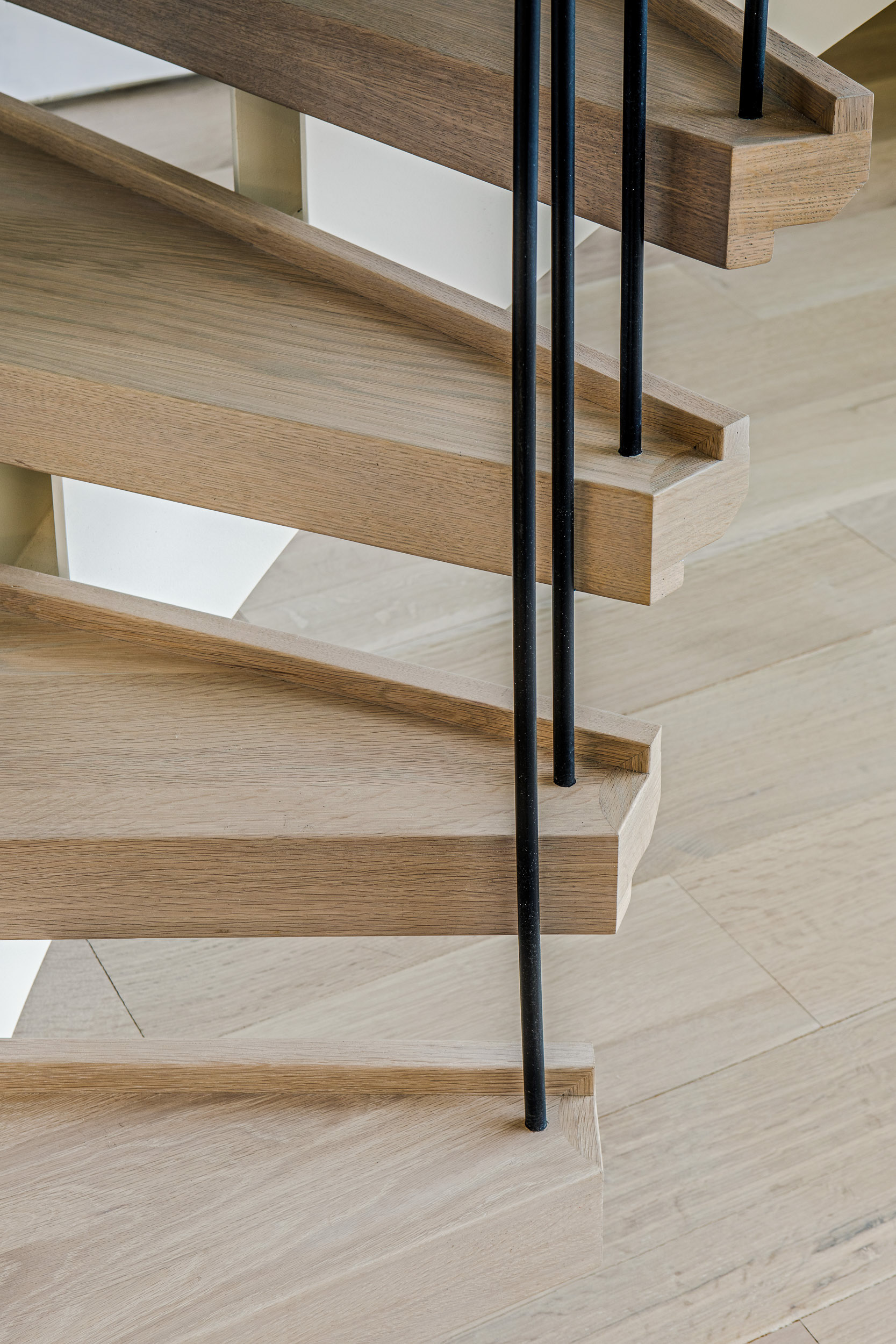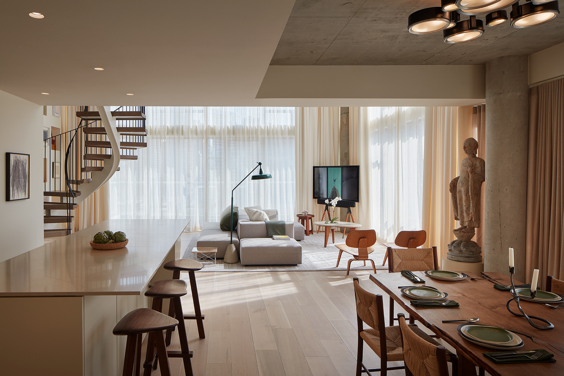 A three-quarter spiral staircase connects the living room to a mezzanine office space. The staircase is supported by one steel stringer and features 15 uniquely stained wood treads. The result is a seamless connection between an ebonized oak floor on the upper-level with a white oak floor on the lower-level.