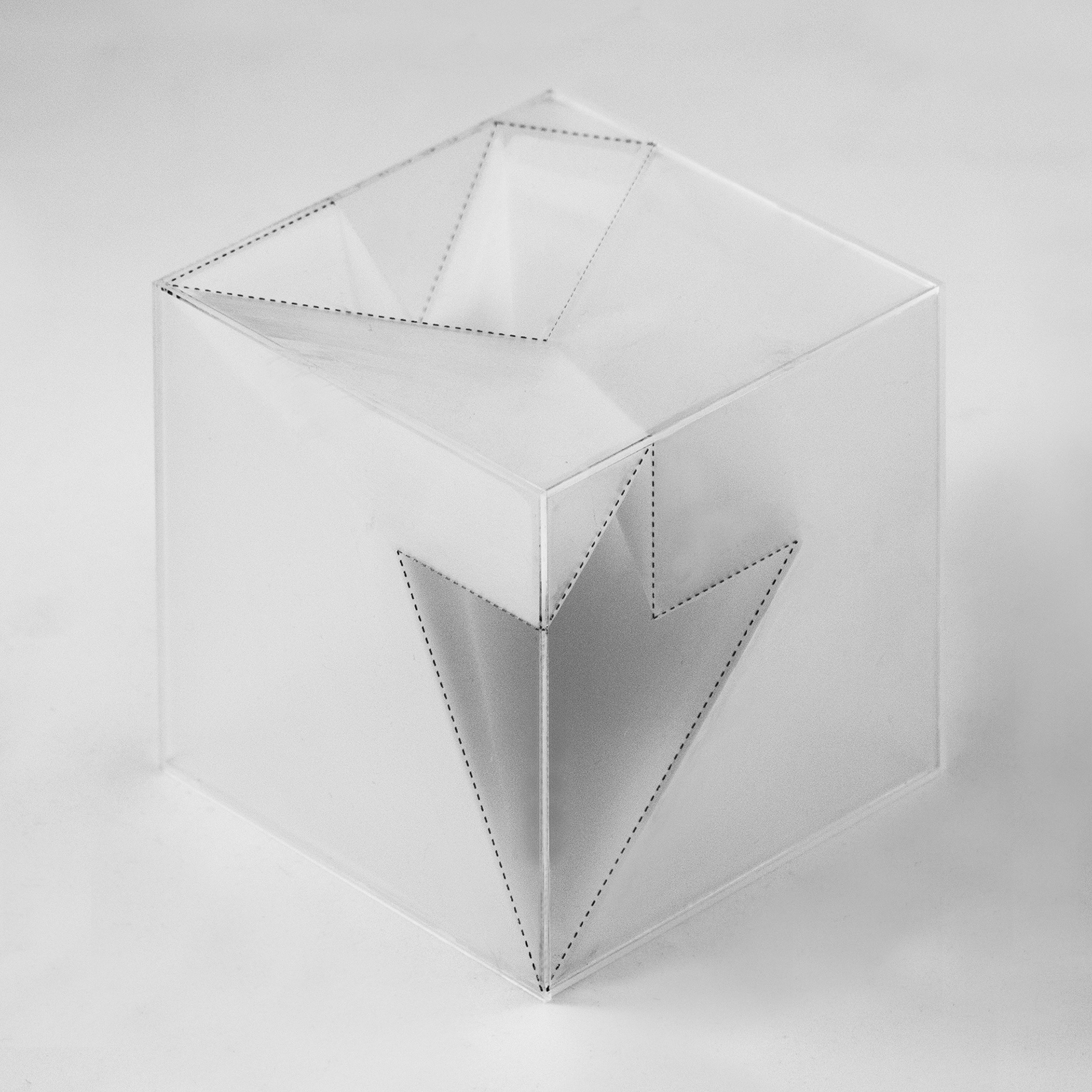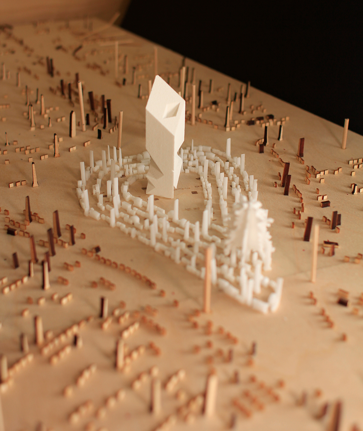The object developed through abstract formal exercises and anamorphic projection has been pressed to serve as a mausoleum/columbarium, and the associate program is used to position my viewer/occupant at the focal point for the privileged view of the form. A labyrinth composed of the relocated memorials and headstones from the site forces the visitor along a path of contemplation to experience 360˚ views of the object before arriving at the privileged focal point. The mausoleum is imagined to have been aggregated over time, each generation adding a mausoleum on top of the previous structure, always projected from the same point.